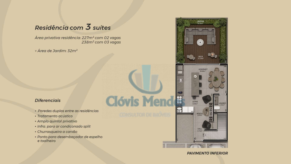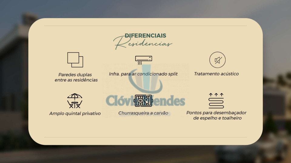 "Diferenciais técnicos: Paredes duplas entre as residências, tratamento acústico, amplo quintal privativo, infraestrutura para ar-condicionado, churrasqueira a carvão, ponto para desembaçador de espelho e toalheiro.