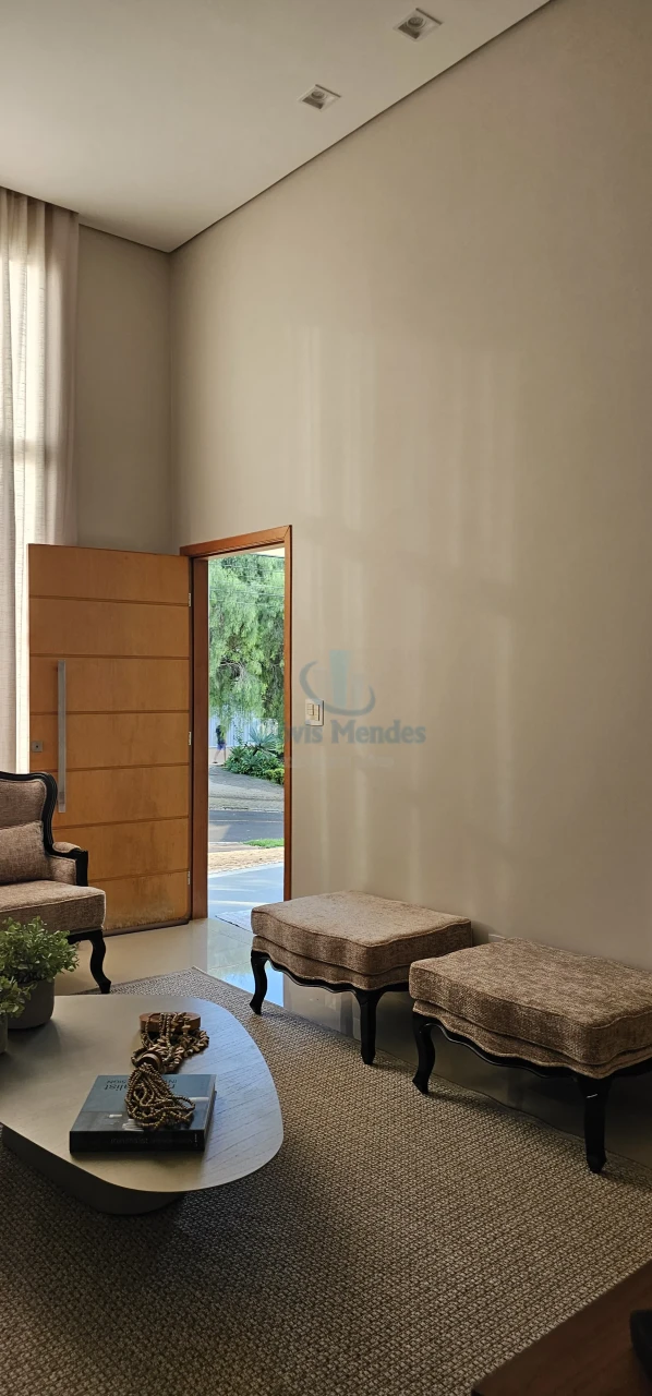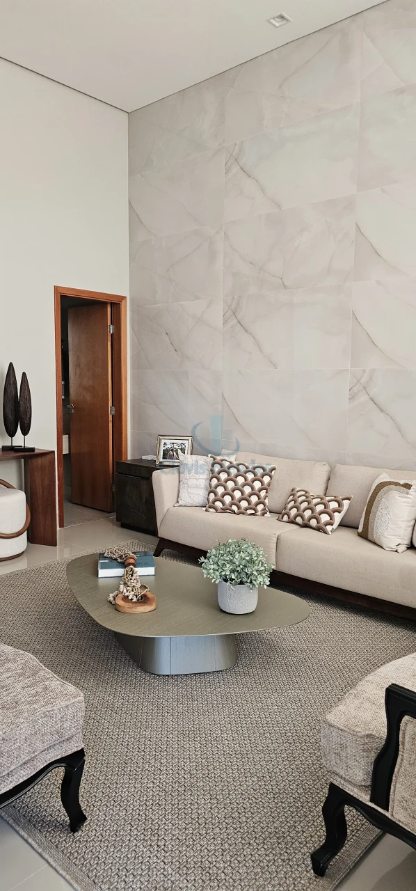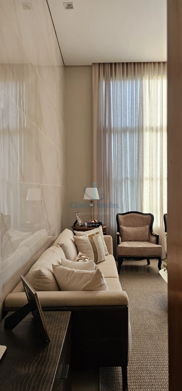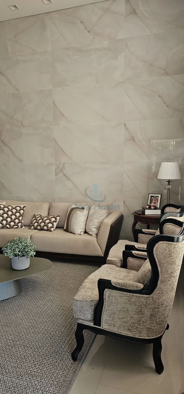 Com 151 m2 de espaço interno, sala de visitas com pé direito duplo, luminárias com iluminação indireta, com revestimento em porcelanato no piso e no painel até o teto