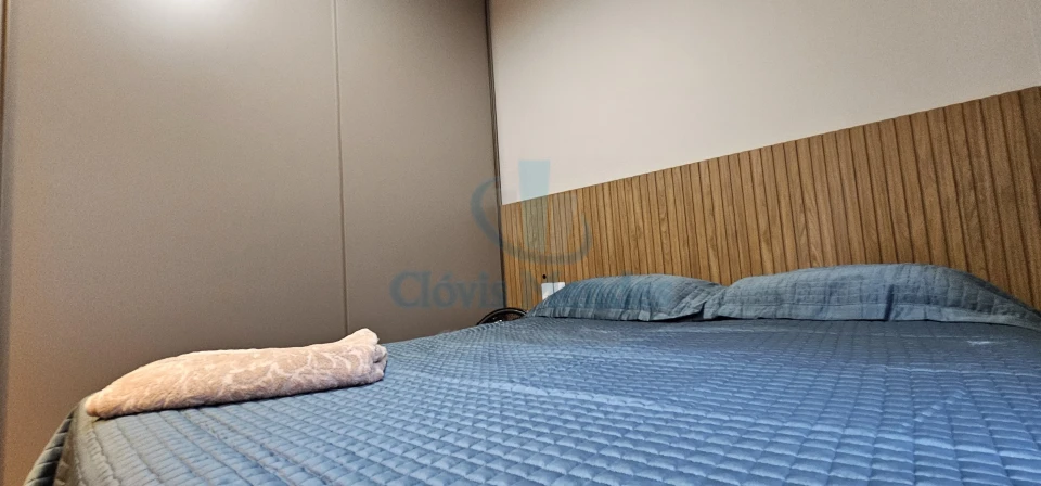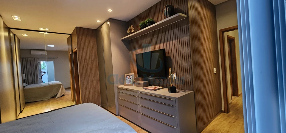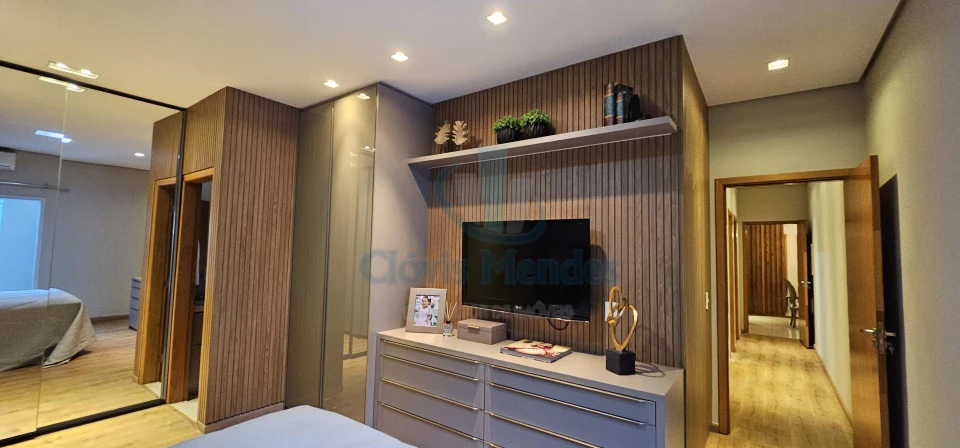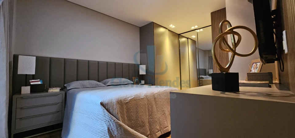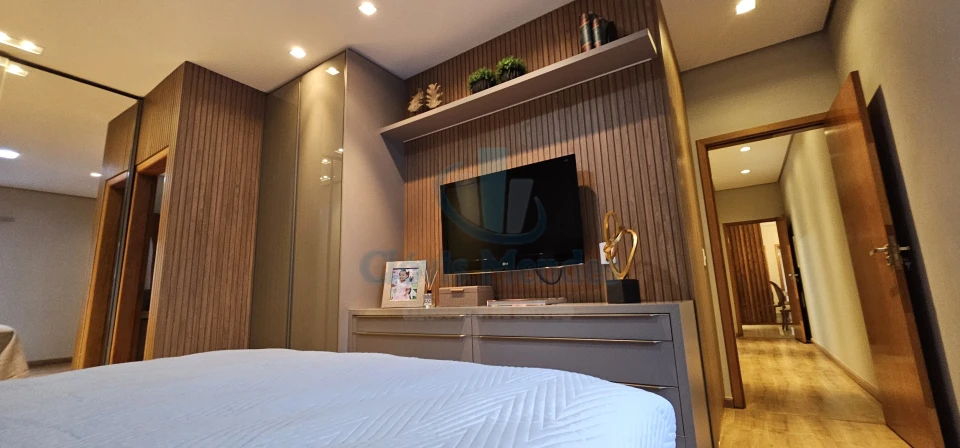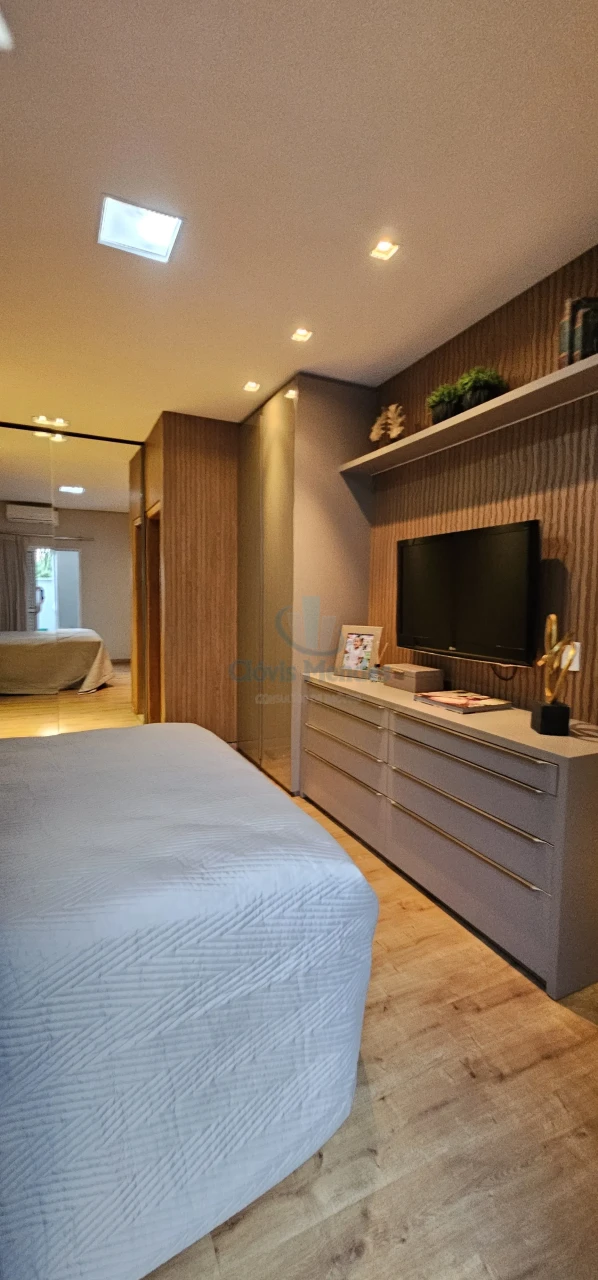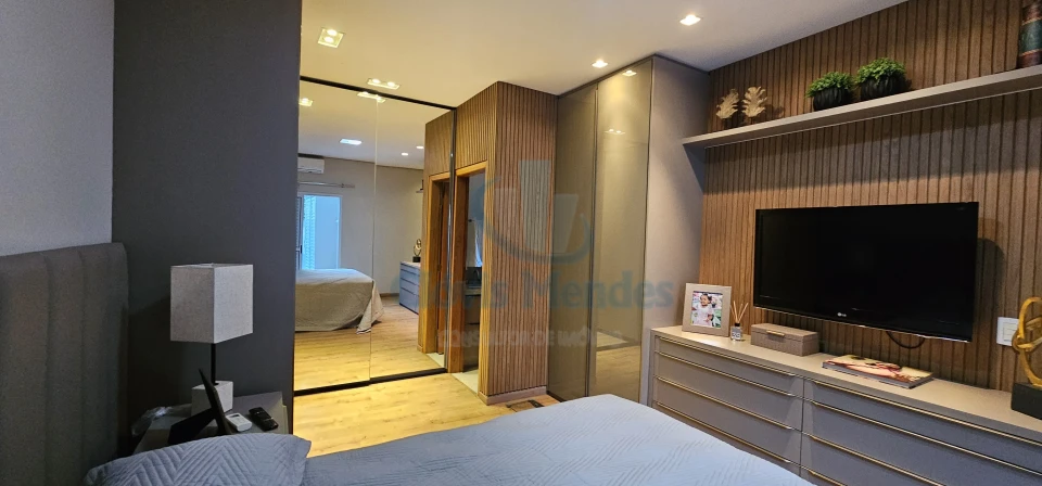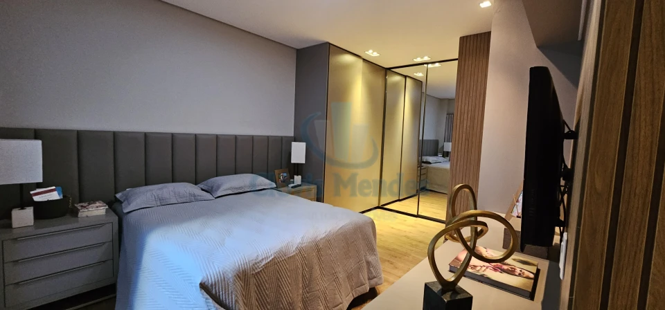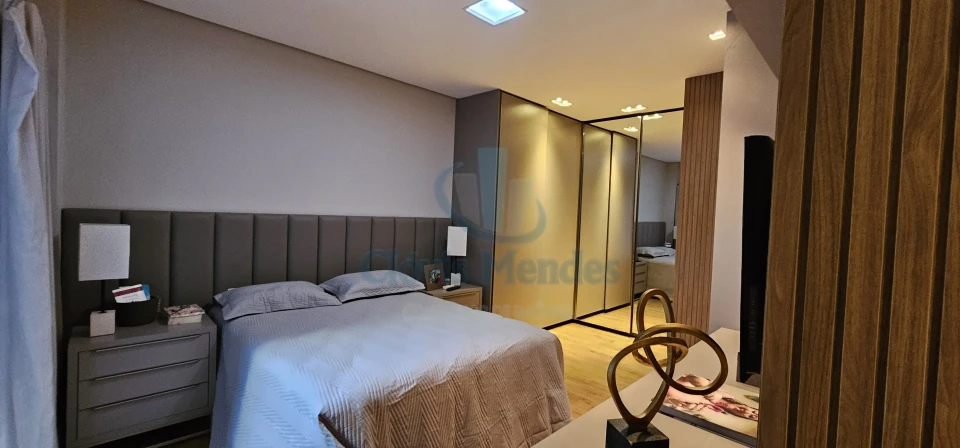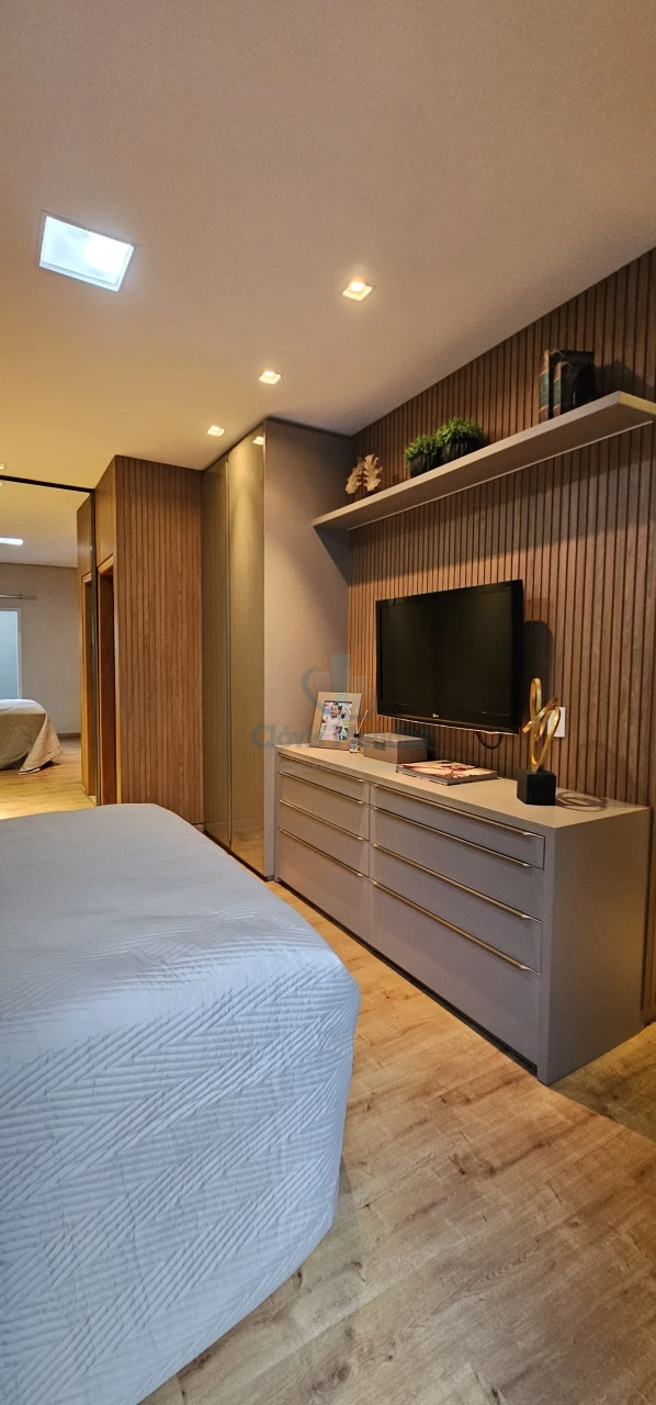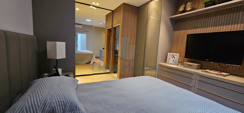 E,uma esplendorosa e aconchegante suíte, decorada com ricos detalhes em madeira,inseridos em planejados de última geração, realçando brilho e elegância.