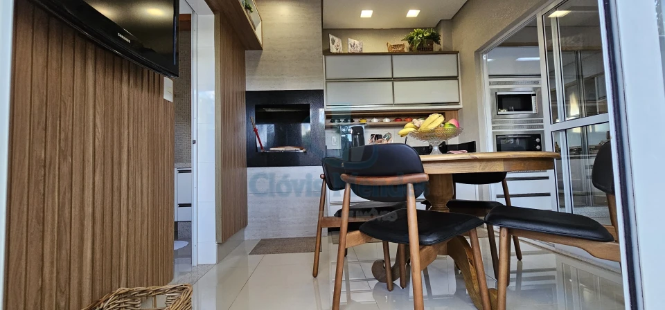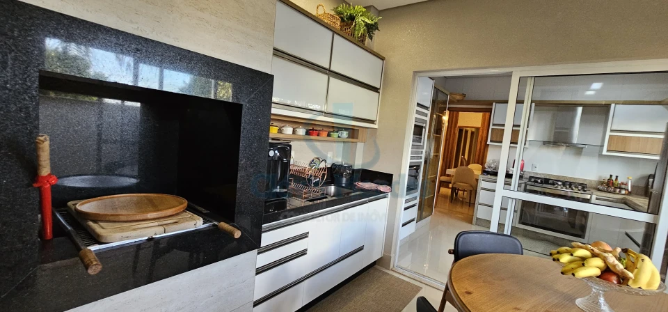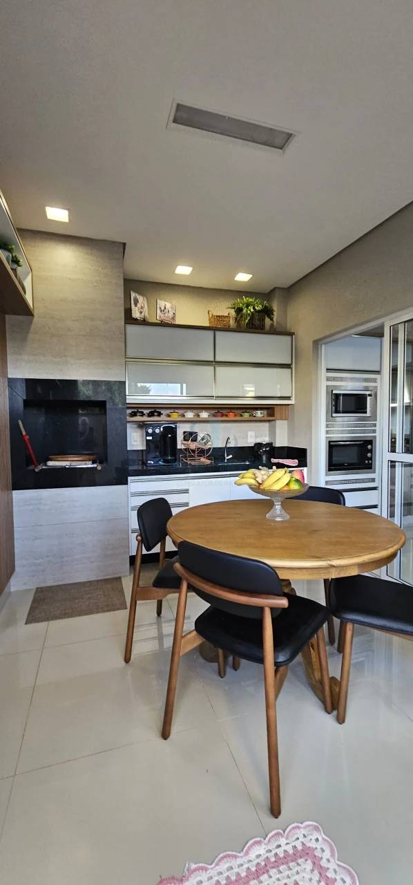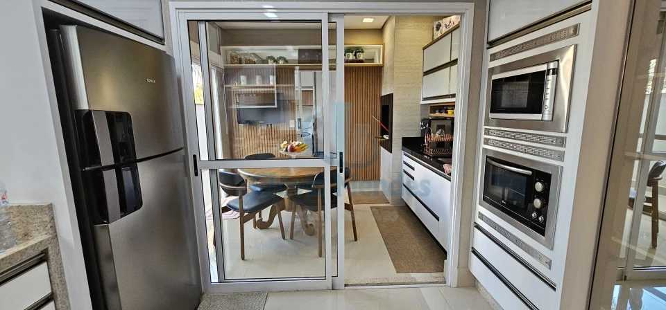 Contendo divisórias em blindex ao lado do Gourmet, criando um ambiente versátil ,com separação visual estilosa, aliado aos detalhes ripados em madeira, a bordo da suntuosa churrasqueira toda revestida em granito