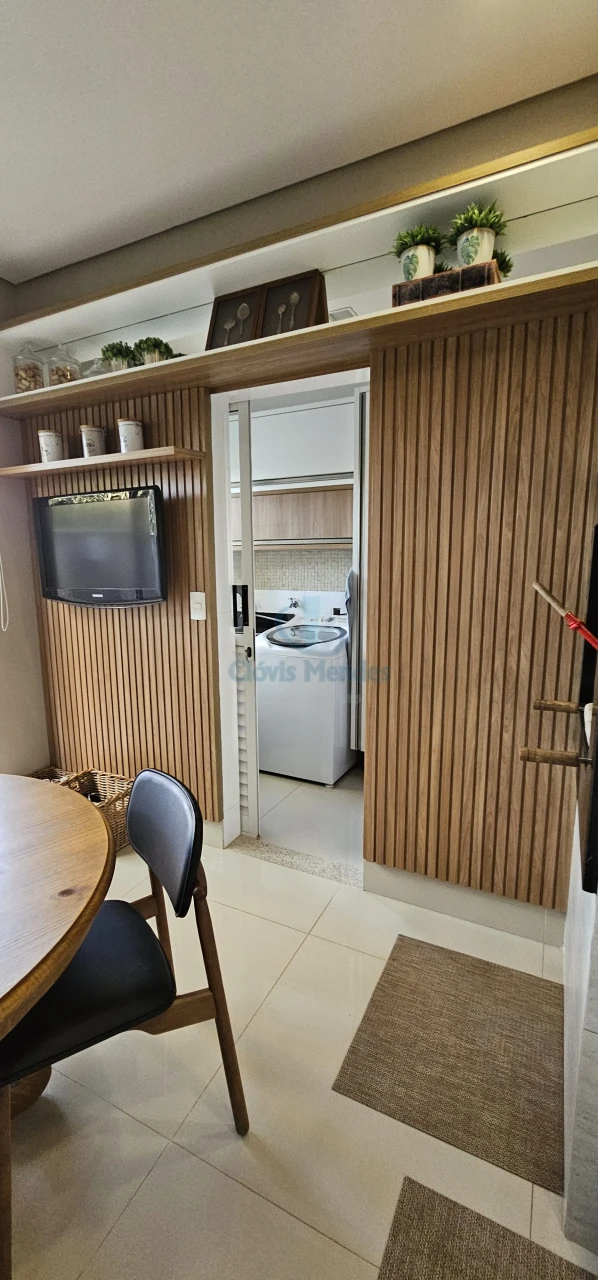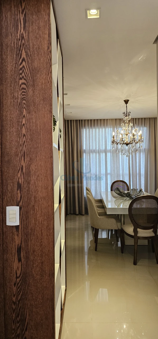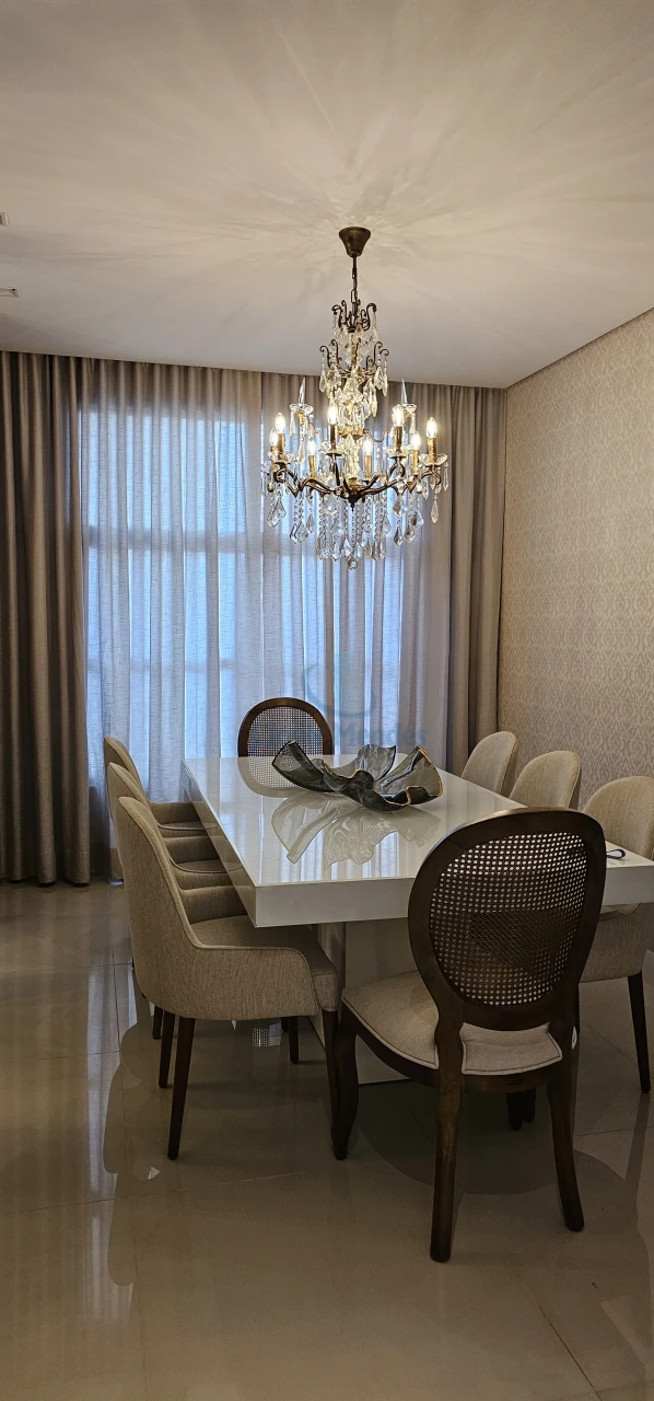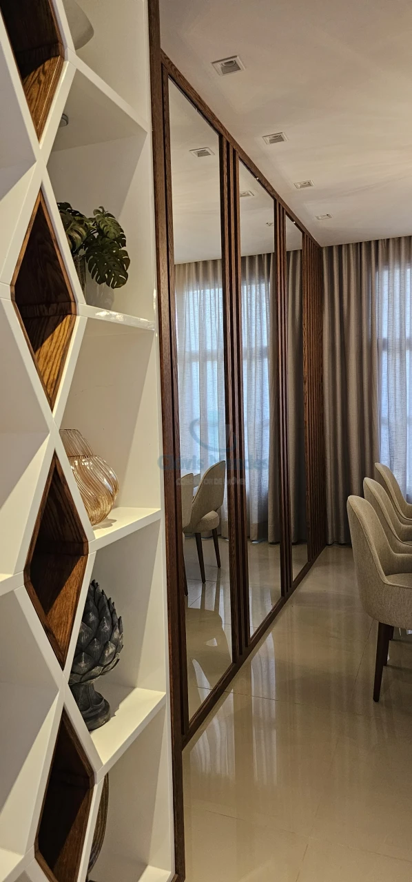 Sala de Jantar, espaço com mesa e 8 cadeiras ,enriquecido com nichos em laca, espelhos emoldurados em MDF,realçando brilho do porcelanato.